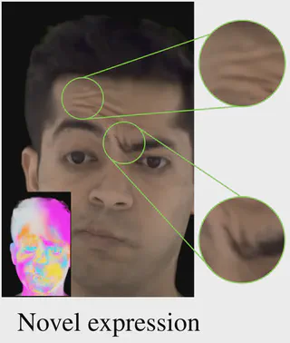 A novel expression rendered by BlendFields. Notice the quality of wirnkles which was not possible to achieve with in prior works.Abstract